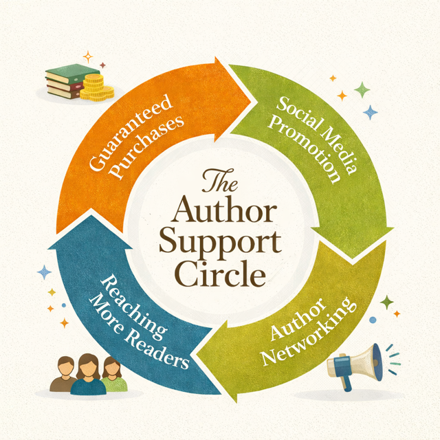 The Author Support Circle is a structured group of authors who commit to supporting one another’s books in a rotating cycle.